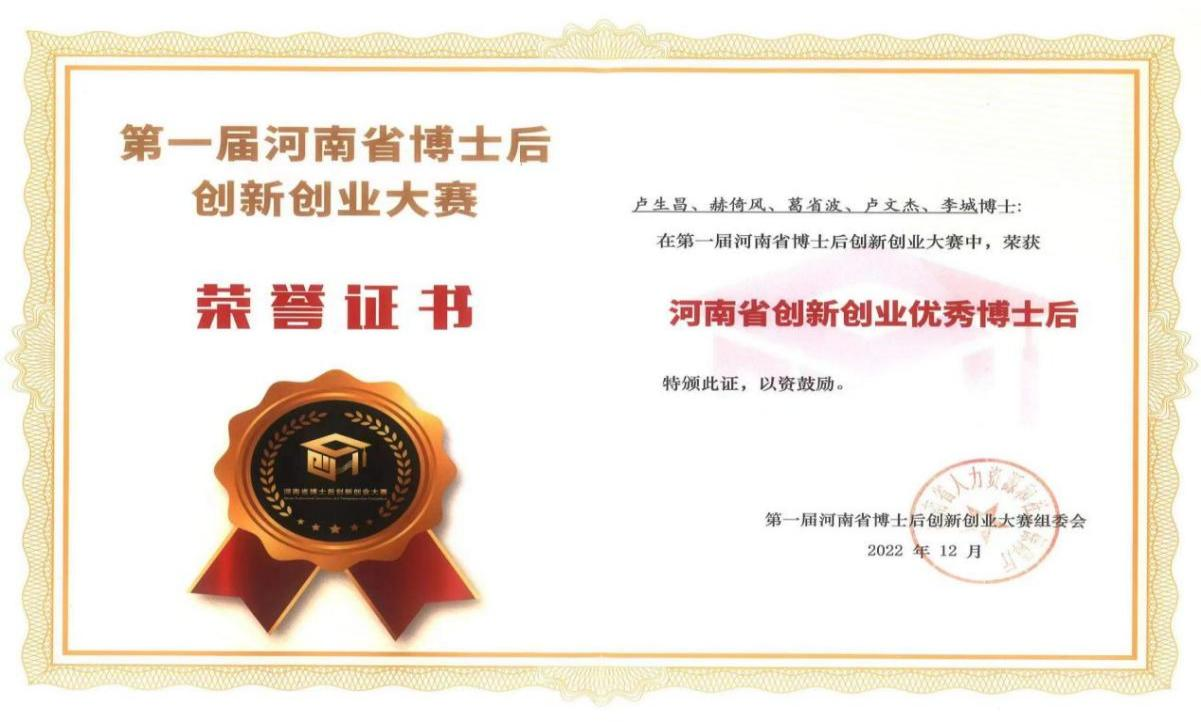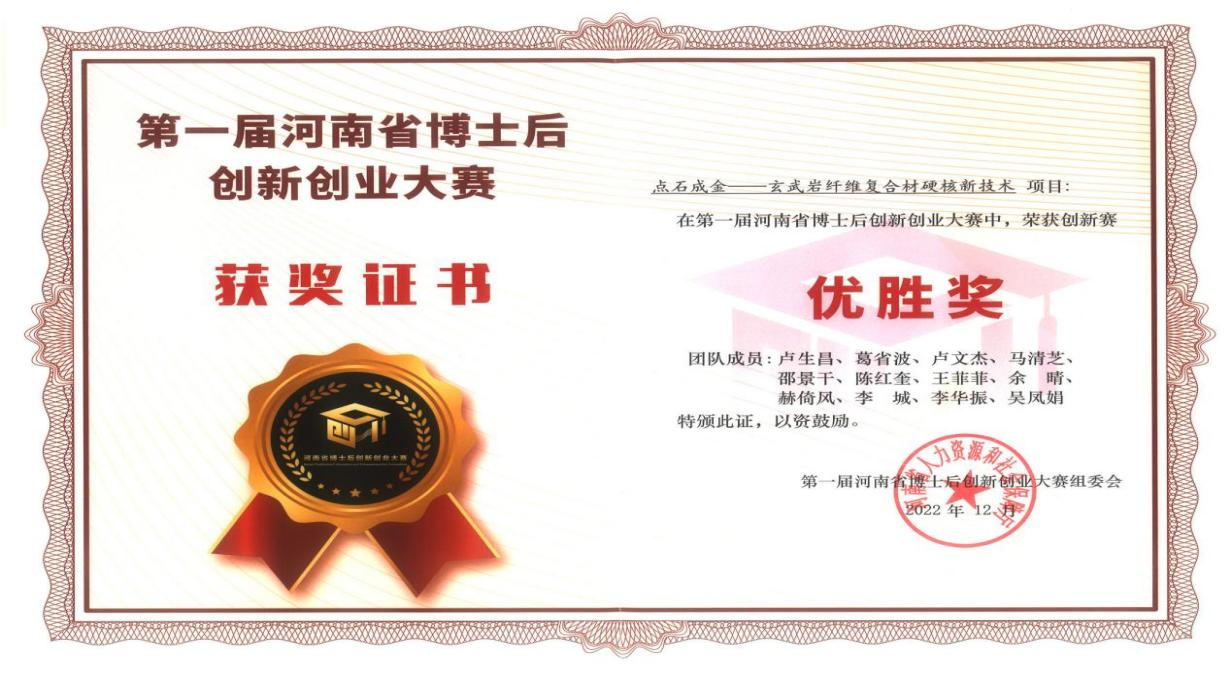 2022年第一届河南省博士后创新创业大赛中,交院工程技术集团博士后参赛团队凭借“点石成金——玄武岩纤维复合材硬核新技术”项目获得大赛优胜奖,团队成员卢生昌、赫倚风、葛省波、卢文杰、李城5人荣获“河南省创新创业优秀博士后”称号。