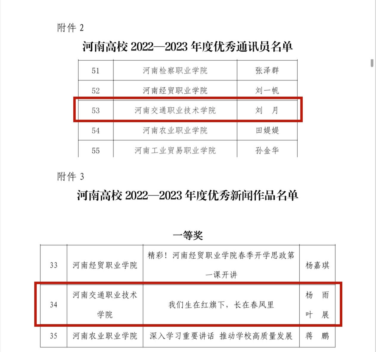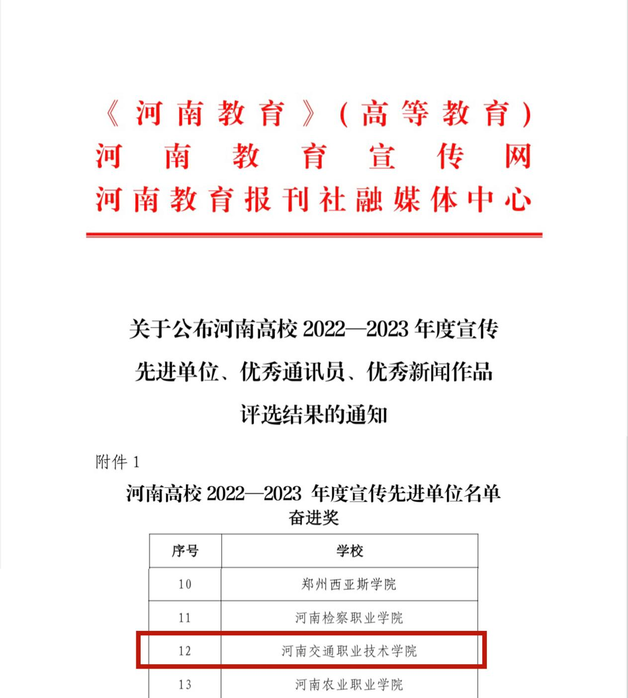 近日,《河南教育》(高等教育)、河南教育宣传网、河南教育报刊社融媒体中心联合印发《关于公布河南高校2022—2023年度宣传先进单位、优秀通讯员、优秀新闻作品评选结果的通知》,我校荣获“河南高校2022-2023年度宣传先进单位”(奋进奖)荣誉称号;1人荣获“河南高校2022-2023年度优秀通讯员”;作品《我们生在红旗下 长在春风里》荣获“河南高校2022-2023年度优秀新闻作品”。