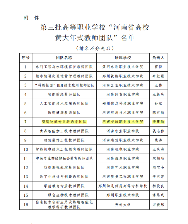 近日,河南省教育厅公布第三批高等职业学校“河南省高校黄大年式教师团队”名单,我校物流学院院长李建丽教授领衔的“智慧物流专业群教学团队”成功入选。