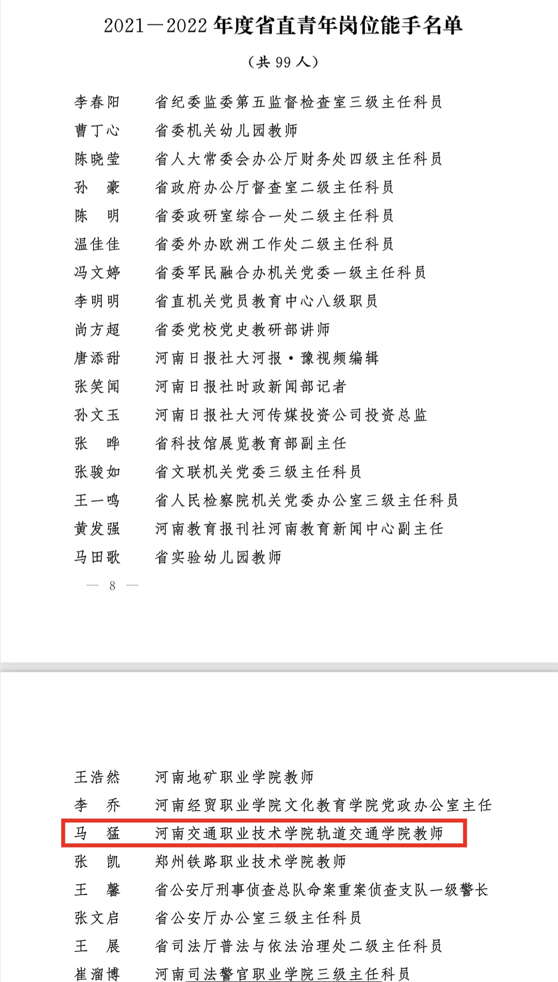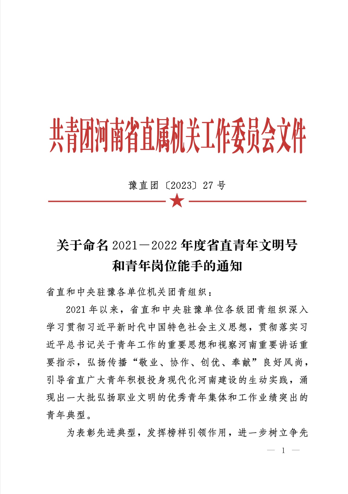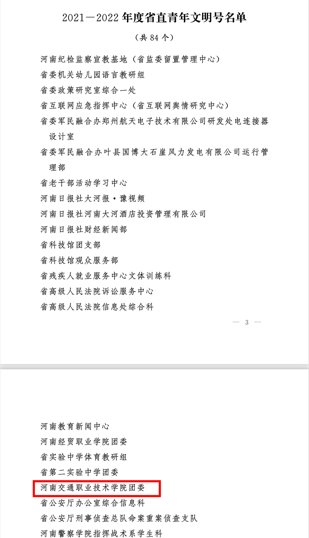 近日,2021-2022年度河南省直“青年文明号”评选结果揭晓,我校团委首次荣获由共青团河南省直属机关工作委员会授予“2021-2022年度省直青年文明号”称号;我校轨道交通学院教师马猛荣获“2021-2022年度省直青年岗位能手”荣誉称号。