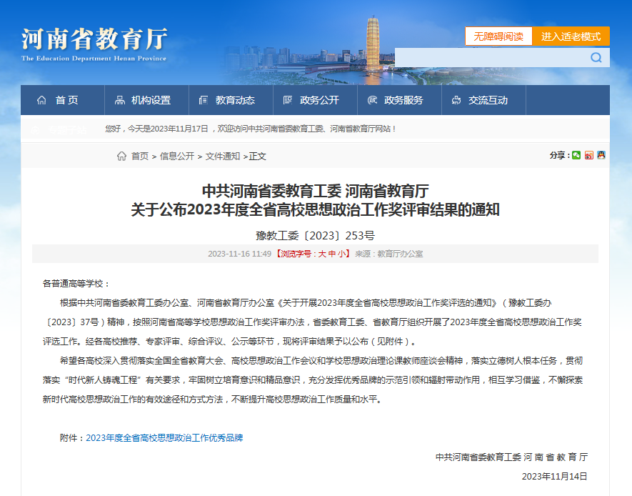 近日,中共河南省委教育工委、河南省教育厅印发《关于公布2023年度全省高校思想政治工作奖评审结果的通知》。经各高校推荐、专家评审、综合评议、公示等环节,我校马克思主义学院报送的《高职军士生“二维三色四品牌”思政育人体系》项目荣获“2023年度全省高校思想政治工作优秀品牌”。