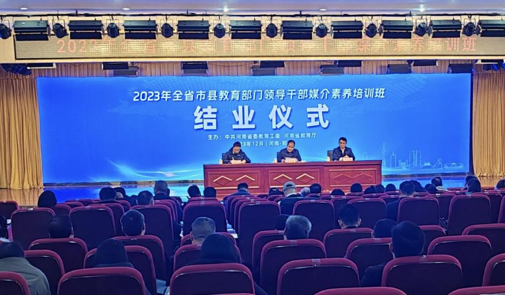 12月12日至15日,2023年全省市县教育部门领导干部媒介素养培训班在我校举办。省委教育工委专职副书记尹洪斌出席开班仪式并讲话,省教育厅二级巡视员黄才华出席结业仪式。党委书记刘志伟,校长焦宏涛分别参加开班仪式和结业仪式。省教育厅机关相关处室、直属实验学校,各省辖市、济源示范区、航空港区、省直管县 (市)、各县(市、区)教育局分管新闻宣传工作的负责同志等200余人参加培训。