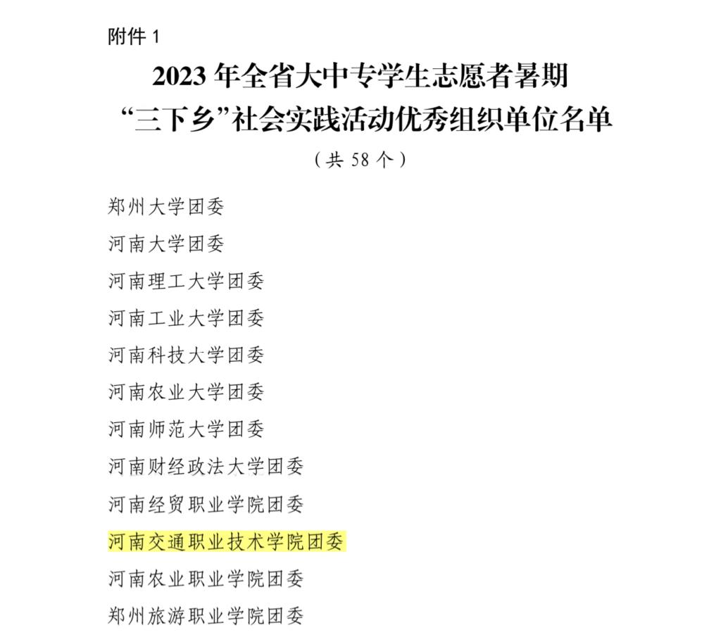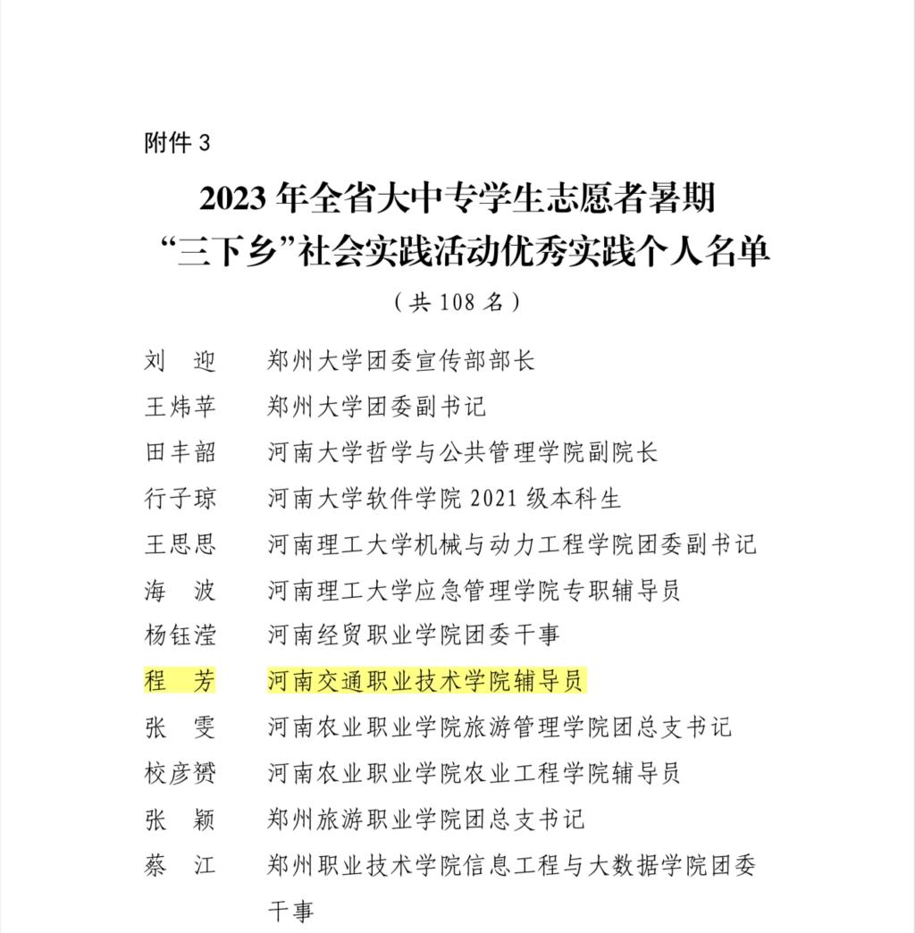 近日,河南省委宣传部、共青团河南省委、河南省教育厅、河南省学生联合会联合印发《关于2023年全省大中专学生志愿者暑期文化科技卫生“三下乡”社会实践活动的通报》。决定对在2023年“三下乡”社会实践活动中表现突出的优秀集体、个人和项目进行通报表扬。我校团委被评为2023年全省暑期“三下乡”社会实践活动优秀单位;公路学院“河南交通职业技术学院公路学院爱之路志愿服务队实践团”被评为2023年全省暑期“三下乡”社会实践活动优秀团队;公路学院程芳老师被评为2023年全省暑期“三下乡”社会实践活动优秀个人。