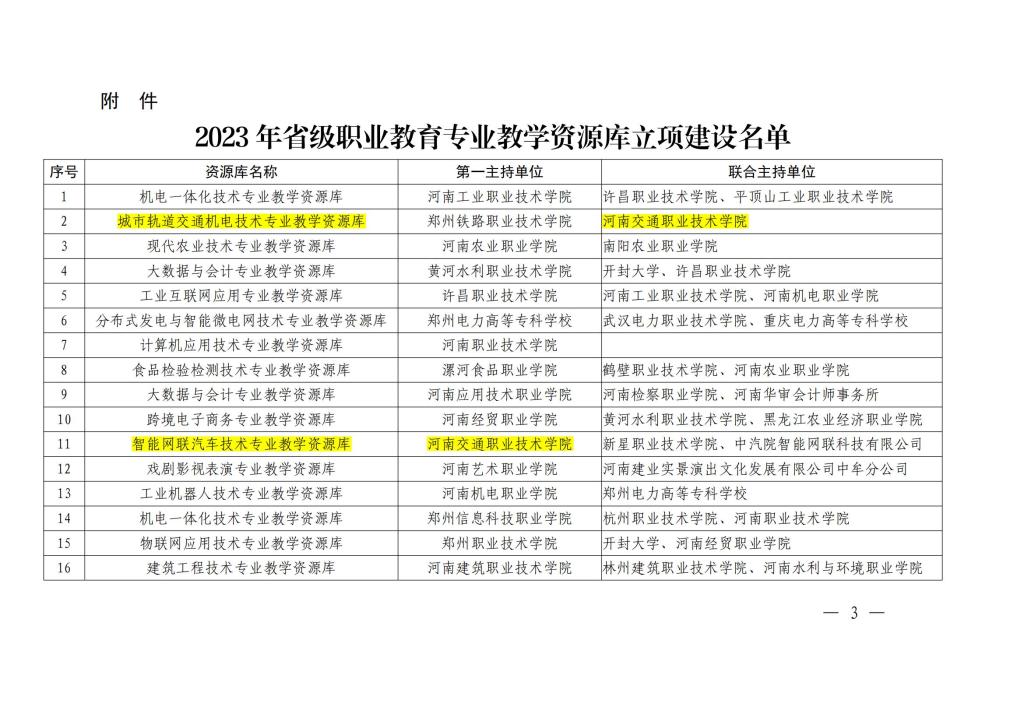 近日,河南省教育厅发布《关于公布 2023 年河南省职业教育专业教学资源库立项建设名单的通知》(教办职成〔2024〕17 号),学校作为第一主持单位推荐申报的智能网联汽车技术专业教学资源库、作为联合主持单位的城市轨道交通机电技术专业教学资源库获批立项建设。