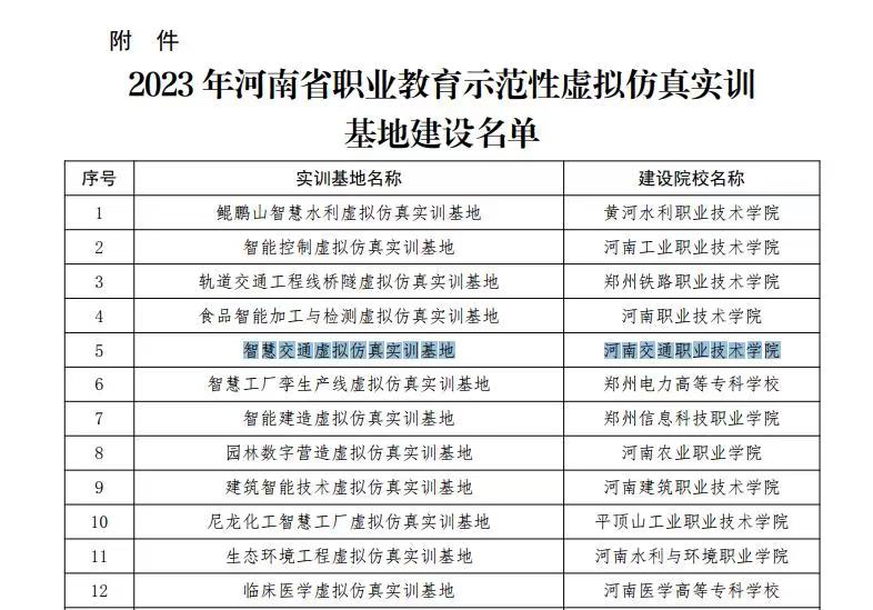 近日,河南省教育厅公布了2023年河南省职业教育示范性虚拟仿真实训基地建设名单,“智慧交通虚拟仿真实训基地”成功入选。