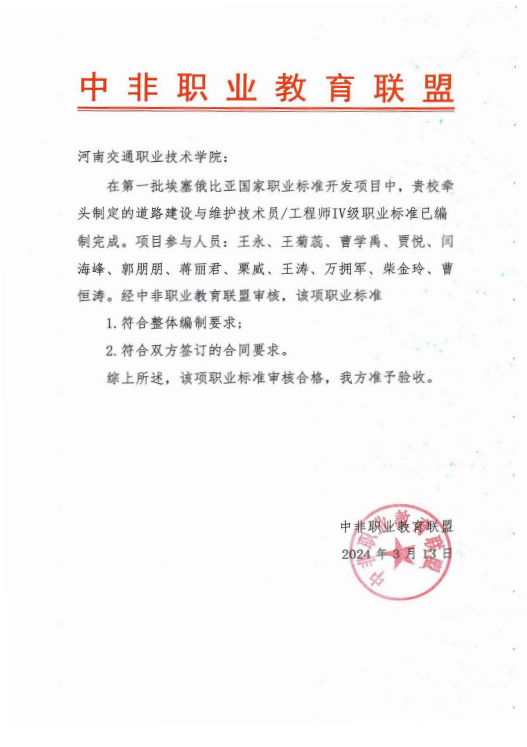 近日,由学校公路学院牵头编制的“道路建设与维护技术员/工程师Ⅳ级职业标准”顺利通过中非职业教育联盟“埃塞俄比亚国家职业标准开发项目”中期验收。