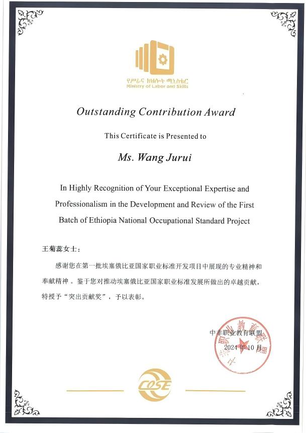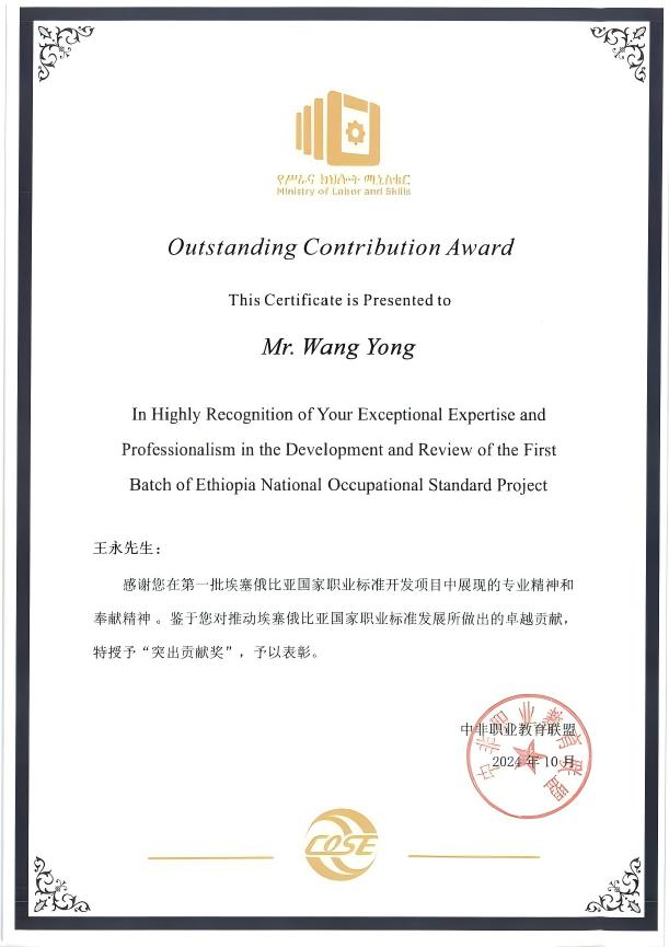 近日,我校公路学院开发的道路建设与维护技术员/工程师(4级)职业标准,在顺利通过埃塞俄比亚劳动与技能部审核认定后,得到埃塞俄比亚劳工部高度认可。王永、王菊蕊两位教师被中非职业教育联盟授予“突出贡献奖”。
