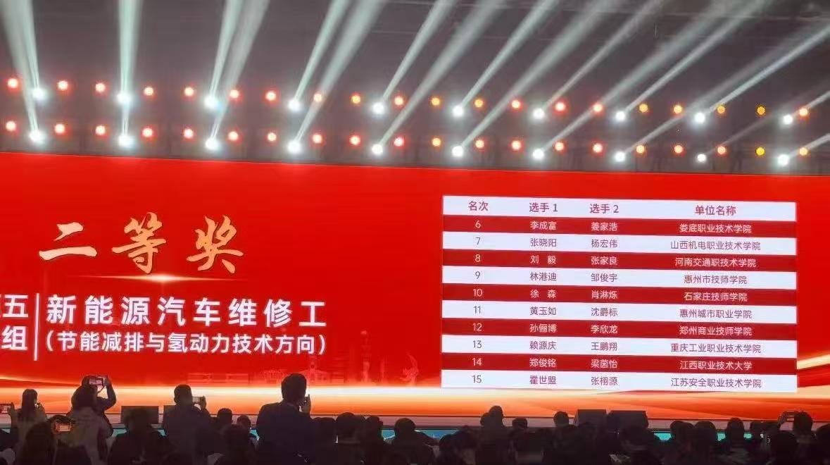在这场激烈的比拼中,我校汽车学院的王培、王晨在新能源汽车维修工(节能减排与氢动力技术方向)赛项教师组获得二等奖;刘会会、程俊阳在机动车检测工(智能网联与车路协同技术方向)赛项教师组获得二等奖;刘毅、张家良在新能源汽车维修工(节能减排与氢动力技术方向)赛项学生组获得二等奖。