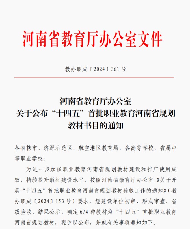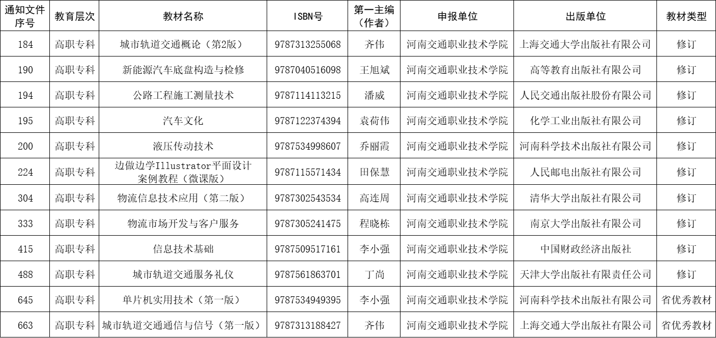 近日,河南省教育厅公布“十四五”首批职业教育河南省规划教材书目,学校《城市轨道交通概论(第2版)》等12部教材成功入选,标志着学校在职业教育教材建设方面取得新突破。