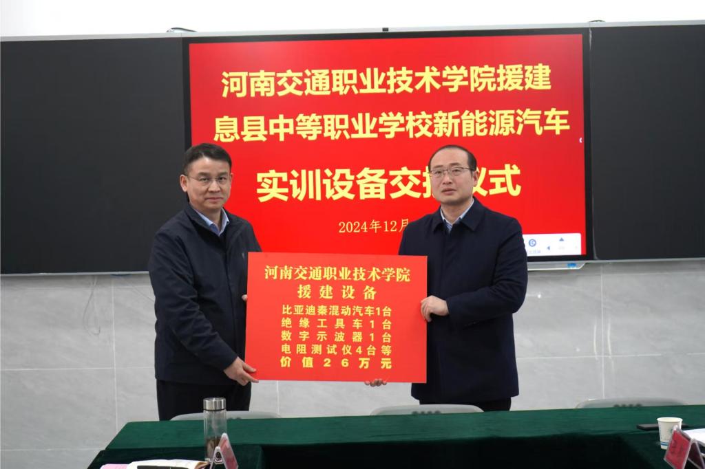 会后,焦宏涛和贡少辉共同参加了援建息县中等职业学校新能源汽车实训设备交接仪式,郑春陪同参观了息县中等职业学校新能源汽车实训车间,学生宿舍和学生餐厅,观摩课堂教学,与学生亲切交谈,了解学生的学习生活情况。
