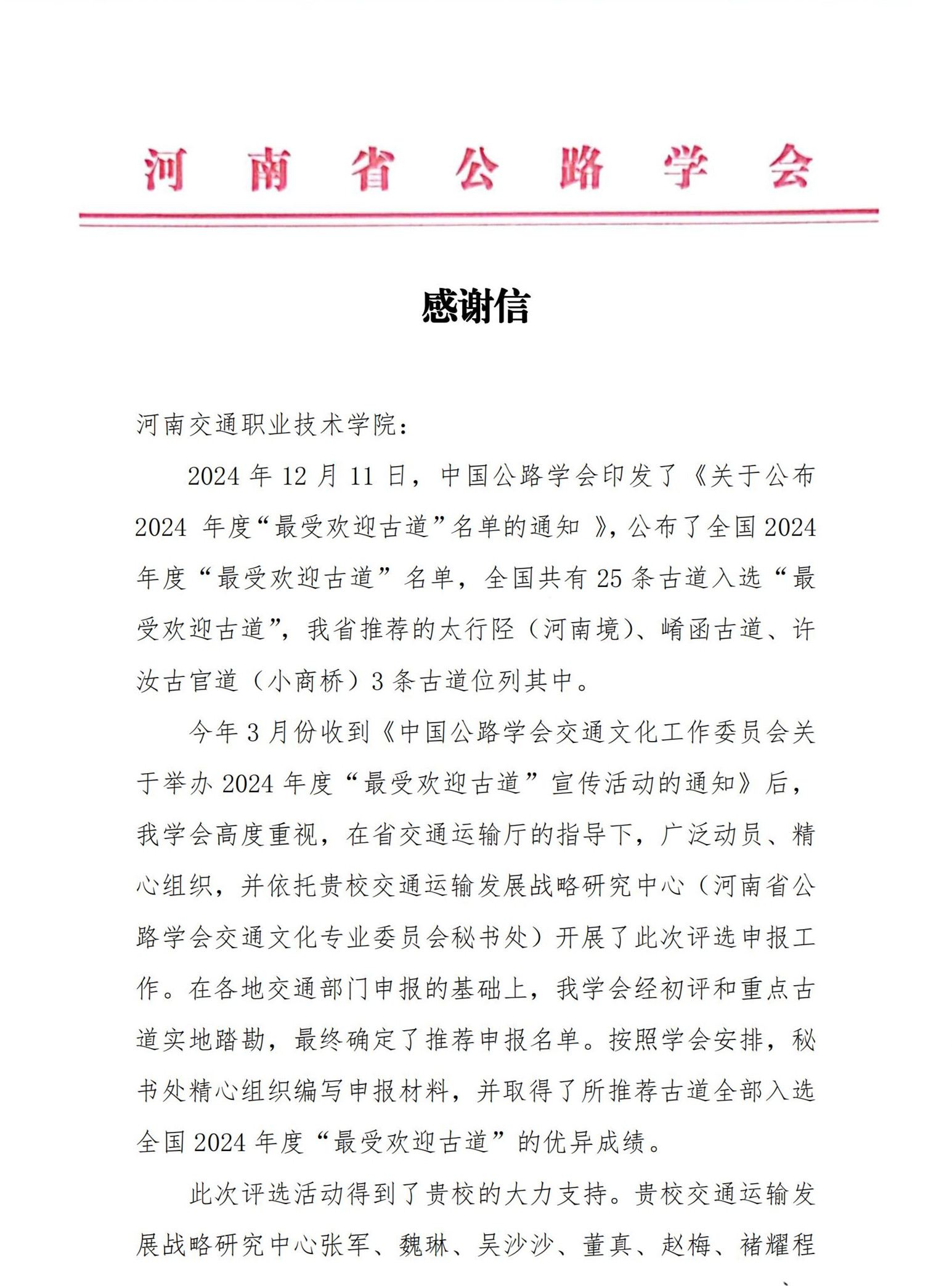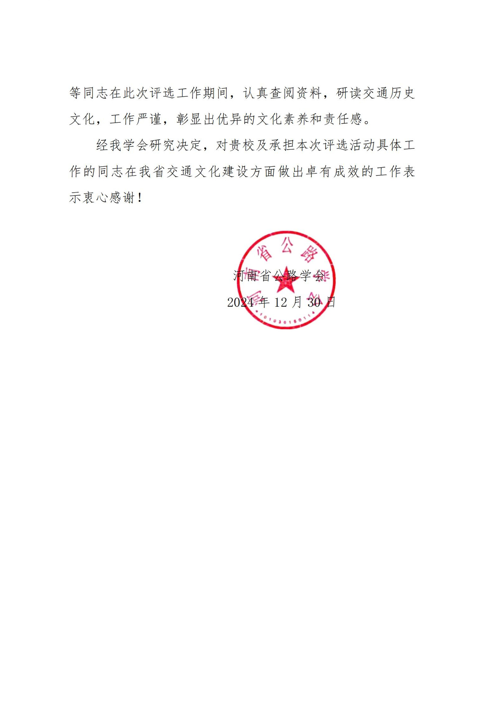 河南省公路学会就我校助力全国2024年度“最受欢迎古道”评选活动发来感谢信