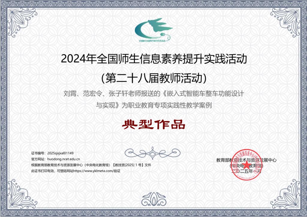 近日,在由教育部教育技术与资源发展中心主办的2024年全国师生信息素养提升实践活动(第二十八届教师活动)中,我校交通信息工程系教师刘霄、范宏令、张子轩提交的《嵌入式智能车整车功能设计与实现》教学实践案例,从1197件职业教育专项作品里脱颖而出,成功获评全国师生信息素养实践性教学案例典型作品