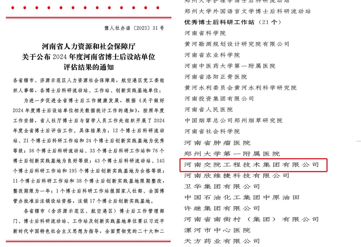 近日,河南省人力资源和社会保障厅公布2024年度河南省博士后设站单位评估结果,全省210家博士后科研工作站有21家获评优秀等级。校所属交院技术集团博士后科研工作站再以优秀等级登榜,连续三年蝉联“河南省优秀博士后科研工作站”称号。