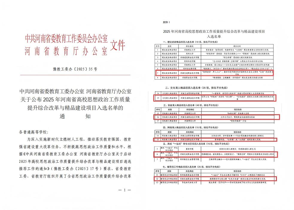 本年度,学校培育入选的项目中,《“矩阵宣讲·声入人心”:推动习近平新时代中国特色社会主义思想“三进”的探索与实践》入选全省理论武装精品项目,《从军士生“样板间”到全校“活力源”:“红色基因”浸润式文化育人模式的实践与探索》入选全省文化育人精品项目,《大中小手拉手,唱响职业体验教育协奏曲》入选全省实践育人精品项目,《青年榜样说:“小屏幕”到“大课堂”的网络育人实践》入选全省网络育人精品项目,《党旗凝匠魂,驻队固匠心,立德育匠才:“豫路先锋”明德社区创新服务实践育人项目》入选全省高校“一站式”学生社区项目,《高职院校学生党支部“红色方向盘”党员发展工作机制创新与实践》入选全省辅导员工作精品项目。