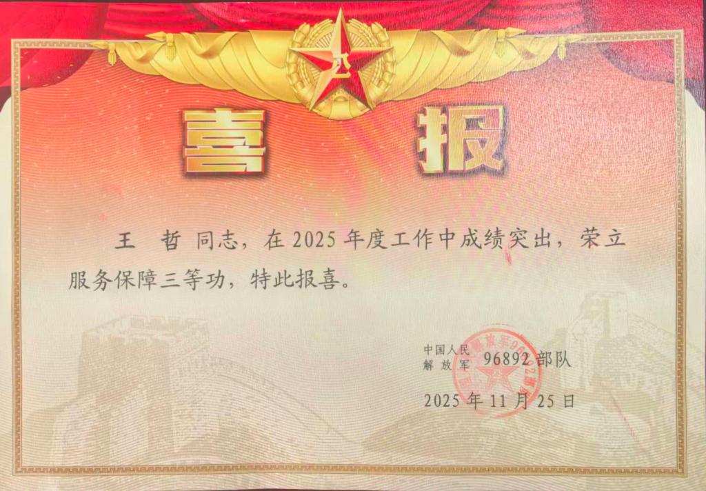近日,中国人民解放军96892部队发来喜报:学校2016级定向培养军士王哲,因2025年度在新闻宣传岗位上的突出贡献,被授予“服务保障三等功”。这是他继2024年获评“三级优秀政治教员”后,再获部队重要表彰。