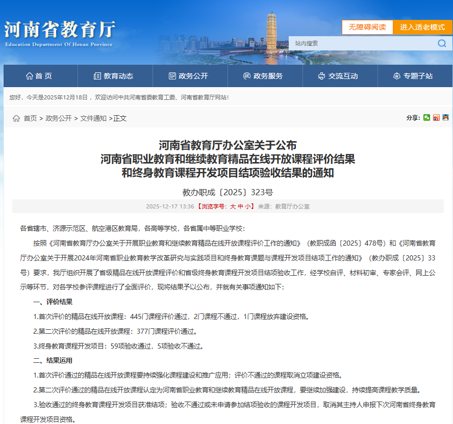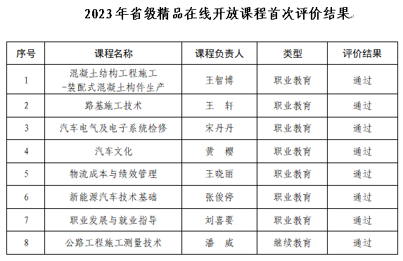 近日,河南省教育厅办公室公布了河南省职业教育和继续教育精品在线开放课程评价结果和终身教育课程开发项目结项验收结果,学校16门省级精品在线开放课程全部通过评价,其中2023年立项的8门课程通过首次评价,2022年立项的8门课程通过二次评价。