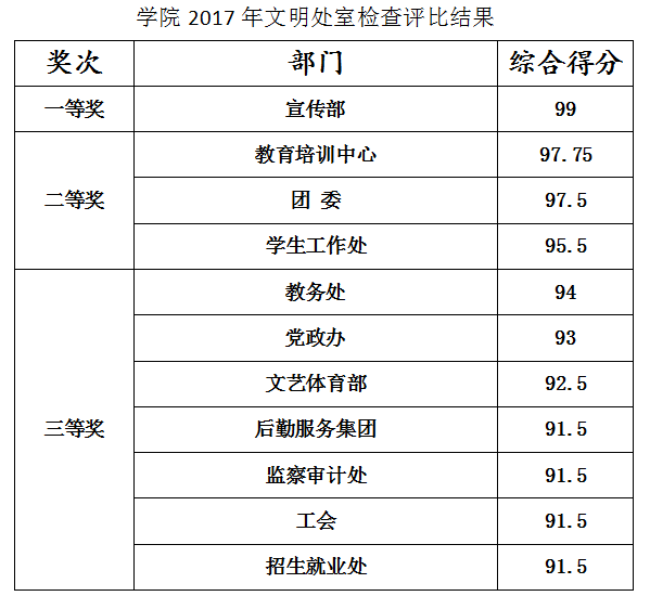 为迎接省级文明单位年度检查验收,更好地营造校园文化氛围,根据《河南交通职业技术学院关于开展文明处室评比活动的通知》要求,学院组织由党政办、宣传部、监察审计处、团委、后勤集团组成的文明处室检查评比小组,于12月28日在全院开展了文明处室检查评比活动,检查评比小组严格按照文明处室评选标准和评分细则,对各处室进行了检查评比,最终评选出一等奖1名,二等奖处室3名,三等奖处室7名,现将检查评比结果通报如下: