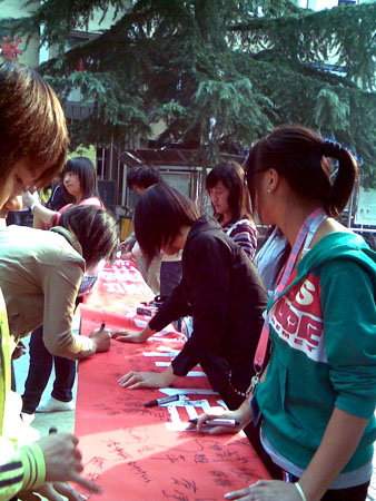 秋高气爽,阳光明媚,午后的交院因同学们的爱心签名而更加美丽。希望本次活动能进一步增强同学们的慈善意识,让爱的接力棒在河南交院一直传递下去。