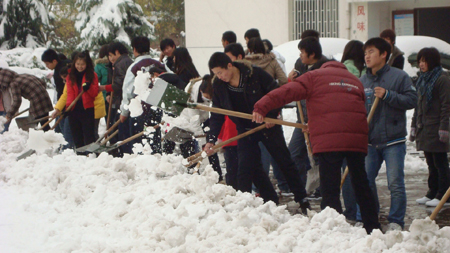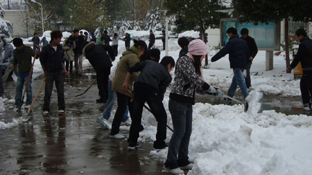 昨晚一场大雪突然降落,由于是今年冬天的第一场雪,校园里到处可以看到欢乐的身影,堆雪人、打雪仗,大家充分的享受着冬日带给我们的寒冷中的温馨,但同时也给师生的出行带来诸多不便。为了使道路畅通,保证师生的安全,今天中午道桥系学生会在团总支的带领下展开了热火朝天的清扫积雪活动,学生们利用扫帚、铁锨等工具将道路上的积雪清理到草坪上,既清扫了道路,又使草坪得到了更好的滋润。经过大家的共同努力,在下午上课之前已将办公楼前和图书馆前的积雪清扫完毕。