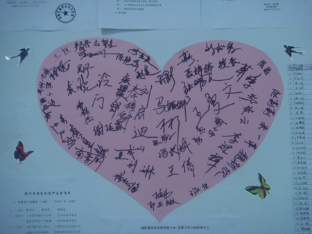 甲流来了,在这场没有硝烟的战争中,我们携手签名,“从我做起”各自写下防控甲流计划,宣誓共抗甲流。我们一方面组织了多场篮球赛,以此鼓励更多同学增强锻炼,一方面善解人意,知道是在特殊时期,在班里为过生日的同学祝福。
