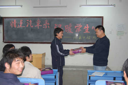 20009年12月2日,我院汽车工程系领导和各年级辅导员亲手把保暖衣送至那些未及时准备防寒衣物的同学手中。