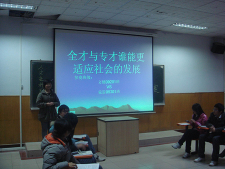 12月3日晚上7点半,人文社科系在北校区实验楼509阶梯教室举办了一场题为“是全才更能适应社会发展,还是专才更能适应社会发展”的辩论赛,2009级新生参加了此次比赛。
