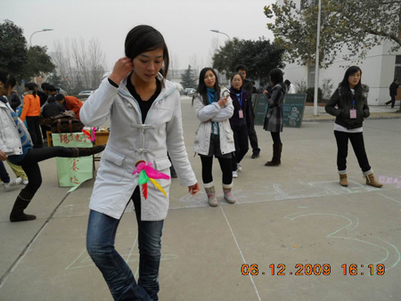 在学院防控甲型H1N1流感封闭管理期间,为了激发广大学生的运动热情,促进学院全民健身运动的开展,营造良好的体育锻炼氛围,以健康的体魄和饱满的热情迎接期末考试的到来。12月6日,由学生工作处主办,院学生会承办的学院第一届“校园吉尼斯”趣味体育活动比赛在南校区图书馆前广场隆重举行。