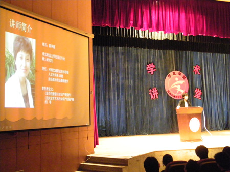 4月27日晚19:00时我院《学术讲堂》邀请人文社科系郭凤丽老师主讲的《法律与山寨的博弈》讲座在艺术中心报告厅开讲。