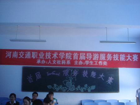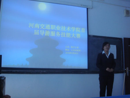 由院学工处主办,人文社科系承办的2010年导游服务技能大赛于5月24日下午和5月25日晚分别在人文社科系多媒体教室举行了初赛和决赛。本次导游服务技能大赛由专业导游老师徐硕、李琼、黄秋霞和王艺军老师作为评委,共有41名学生参加了初赛,11名初赛胜出者参加了决赛。