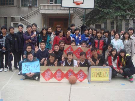 在比赛中,同学们积极投入,矫健的身姿,精彩的投篮,呐喊声、欢笑声漫成一片,整个赛场洋溢着快乐融洽的气氛。球赛持续到下午5:30分,最终旅游10301队获胜。随后由辅导员、负责2010级新同学日常管理和心理辅导的09级同学分别与自己所带班级同学合影留念。