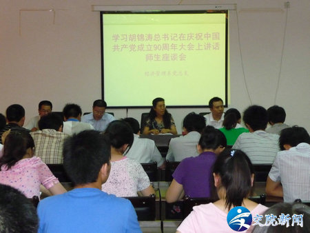 7月7日下午,经济管理系党总支召开学习胡锦涛在庆祝中国共产党成立90周年大会上重要讲话精神师生座谈会。座谈会在办公楼四楼会议室举行,经济管理系党总支成员赵学峰、李建丽、闫洪林、程晓栋和50名毕业生党员参加了座谈会。 座谈会上,毕业生党员怀着激动地心情纷纷发言。大家结合大三的实习经历、预备期内对党的认识体会,畅谈中国共产党成立九十周年取得的丰功伟绩,回顾党的光辉征程,重温入党誓词,领会胡锦涛在庆祝中国共产党成立90周年大会上重要讲话精神。大家一致表示:胡锦涛总书记的讲话振奋人心、催人奋进,特别是提到党和人民对青年人寄予厚望。作为青年学生,一定要继承党的优良传统和光荣使命,坚定理想信念,增长知识本领,锤炼品德意志,矢志奋斗拼搏,在人生的广阔舞台上充分发挥聪明才智、尽情展现人生价值,永远跟党走,报效国家,为母校争光! 最后,经济管理系党总支寄语毕业生党员:牢记党员身份,发挥先锋模范作用;铭记入党誓词,争创一流佳绩,让青春在为党和人民建功立业中焕发出绚丽光彩。 (供稿:经济管理系 图文/贾东豪) |