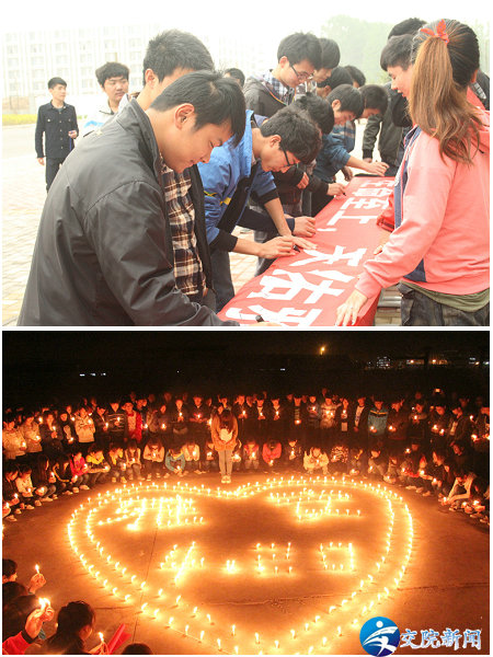 4月23日,学院团委、学工处、学生联合会组织我院学生分别在新老校区举行了心系雅安,为灾区祈福活动。