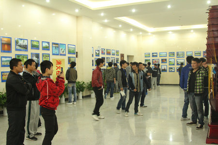 为营造清新高雅的校园文化氛围,庆祝学院六十华诞, 由院团委主办的第七届校园文化艺术节书画、摄影、手工艺、海报展在新落成的图书馆大厅里展出。