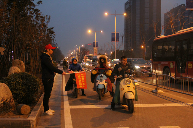 “您好,电动车请走非机动车道!”......4名头戴小红帽、手持文明出行小红旗的志愿者在交警的指导下,对路口非机动车闯红灯、越线等候红灯和行人“中国式过马路”等不文明交通行为进行劝导、纠正。志愿者们不畏寒冷,屹立在执勤路口,认真地执行着交警安排的任务,成为街头一道亮丽的风景线。