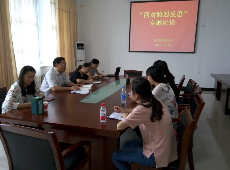 7月19日,基础部党支部在新校区召开“对照讲政治、有信念标准,反思坚守理想信念情况,增强党性观念”专题学习讨论会,党支部全体党员参加专题讨论。