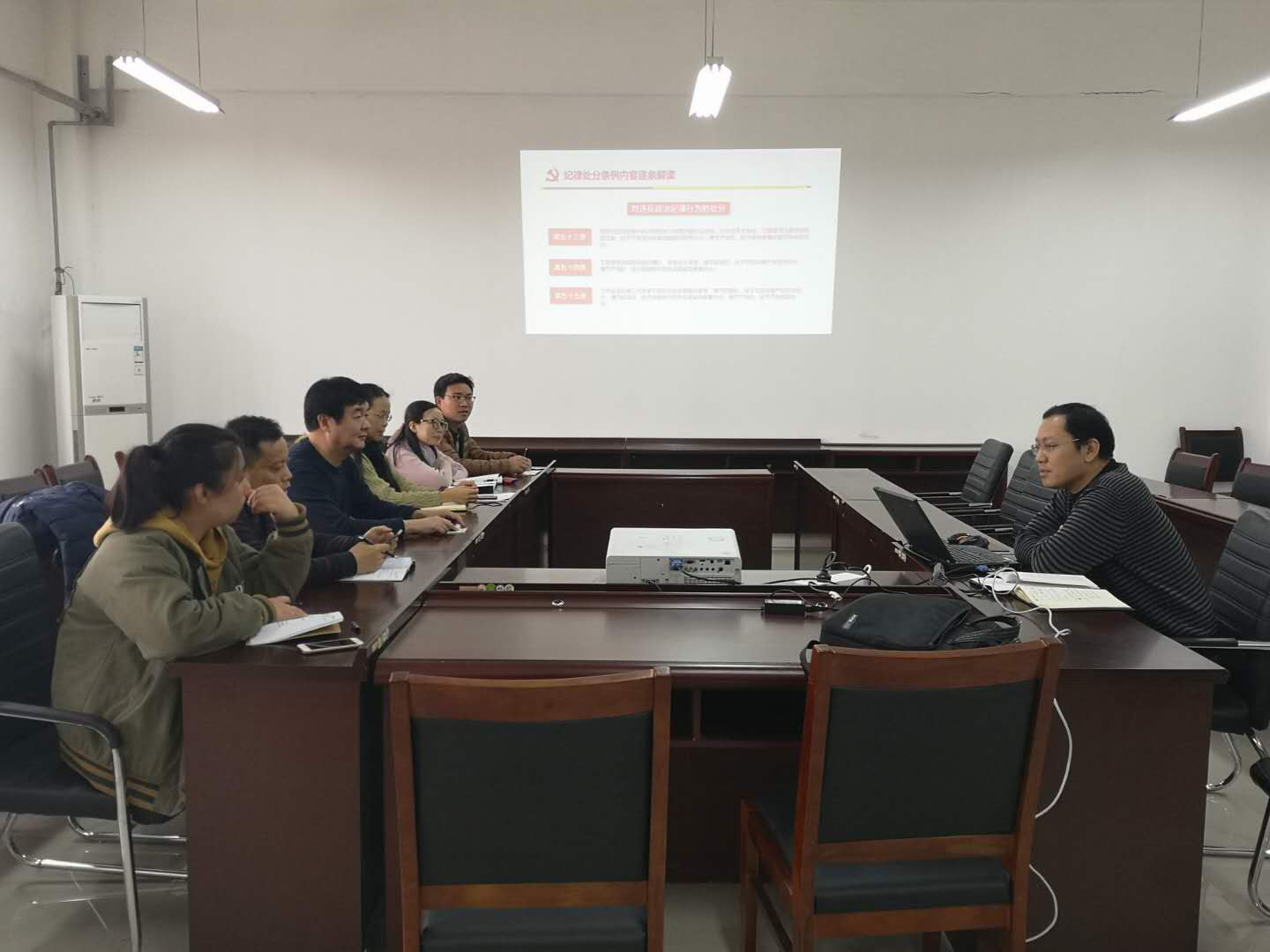 在励志楼会议室,卢旺林为教辅党总支各位党员教师讲述了关于贯彻《中国共产党纪律处分条例》的重大意义,并结合近期党风廉政教育专题的真实案例,要求党员同志要时时用党章要求自己、事事用纪律管住自己,做到筑牢防线、坚守底线。他用生动形象的语言,结合陕西典型案例提醒党员同志要严守政治纪律、政治规矩,坚决维护党中央的权威和集中统一领导,坚决不做违反党纪之事,以实际行动践行对党忠诚,为学院发展提供坚强的政治保证。