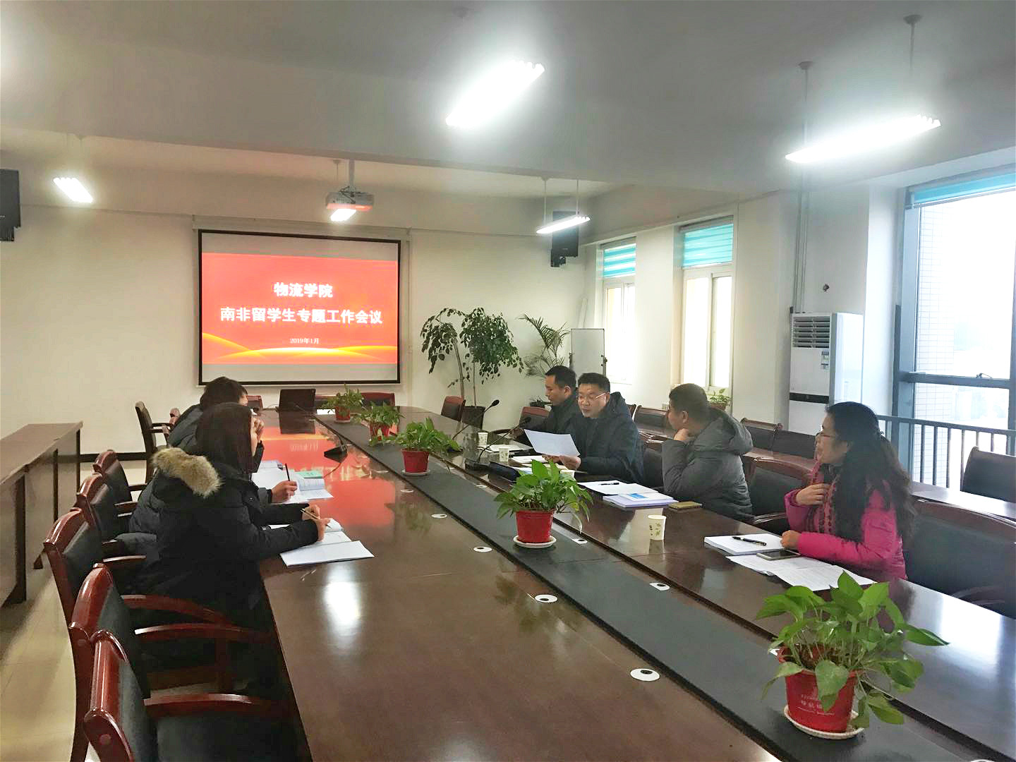 2019年1月10日下午14:30,物流学院在6A202召开了南非国际学生专题工作会议,就南非国际学生的接收工作做了全面的部署和安排。会议邀请了学院宣传部负责人赵学峰和学工处处长张震出席,物流学院院长李建丽和南非国际学生班主任周威、兰尧,随班翻译曾佩佩。会议由物流学院党总支书记程晓栋主持,