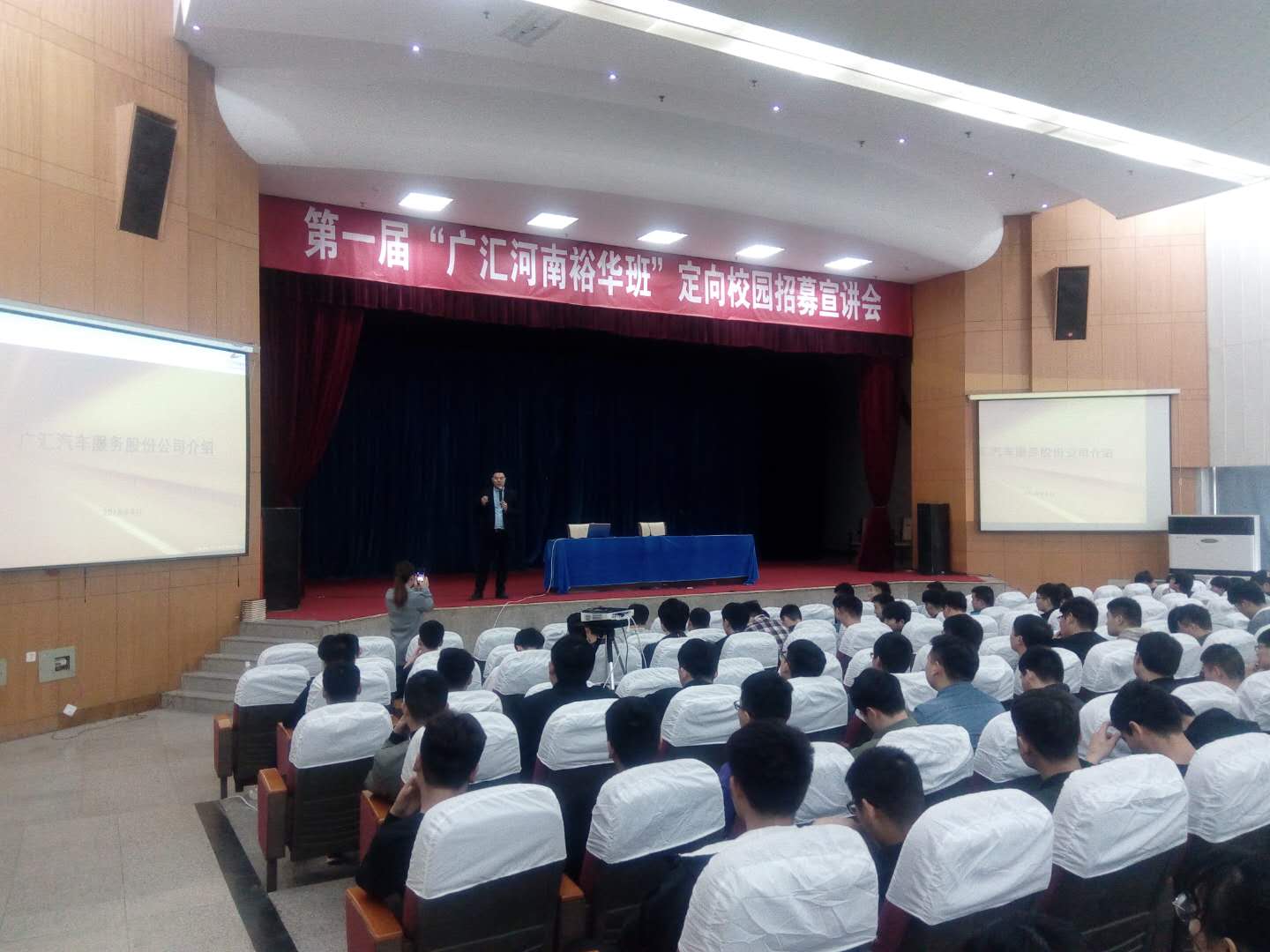 3月20日下午,第一届“广汇河南裕华班”定向校园招聘宣讲活动在航海路校区艺术中心举行。汽车学院2017级汽运、汽电、汽营、车身修复等专业近300名学生参加。