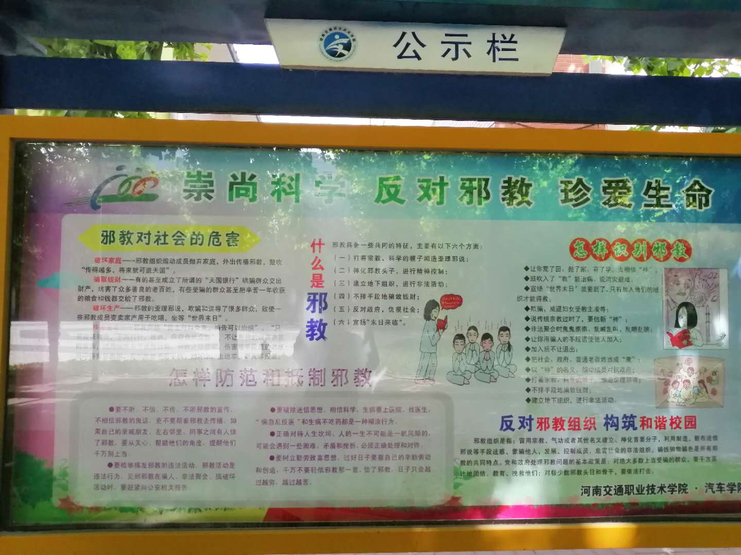 活动中,汽车学院团总支牢牢把握舆论导向,安排各班观看反邪教教育影片,辅导员借助PPT多角度向同学们讲述邪教的基本特点、邪教的骗人手法和危害,以及如何防范邪教等等方面的内容,此外我院还积极通过校园宣传橱窗和教学楼宣传展板、微信公众号等多种宣传媒介在师生中大力开展宣传教育活动,积极宣传党和政府防范和处理邪教问题的方针政策,揭露邪教本质与危害,倡导大家做反邪的先行者,做文明的交院人。