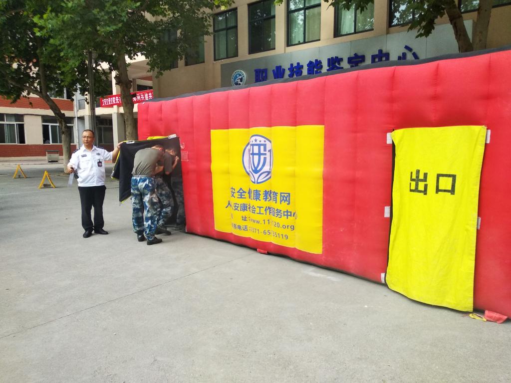 此次消防培训,首次采用 “逃生帐篷”,真实的模拟火灾现场环境,内设有隔断墙,将帐篷内空分隔成迂回曲折的走道空间,为迷宫形式,设有1个进口和1个出口并分开设置,进出口上设有遮光用的门帘。大家在烟雾缭绕的帐篷内感受火灾发生时的模拟状态,按照帐篷内的标识找到正确的道路,最后顺利地从出口“逃生”。