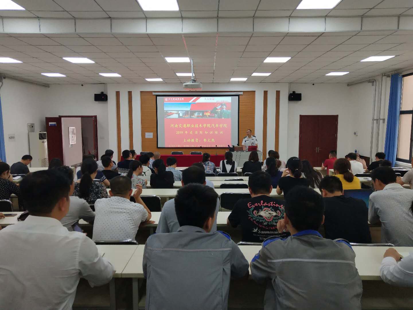 6月19日下午,汽车学院邀请河南省消防协会宣传服务中心教员李文然在航海路校区开展2019年夏季消防安全知识讲座及逃生演练活动,航海路校区各单位、楼管、餐厅、物业服务人员、学生宿舍寝室长等400多人参加了本次活动。