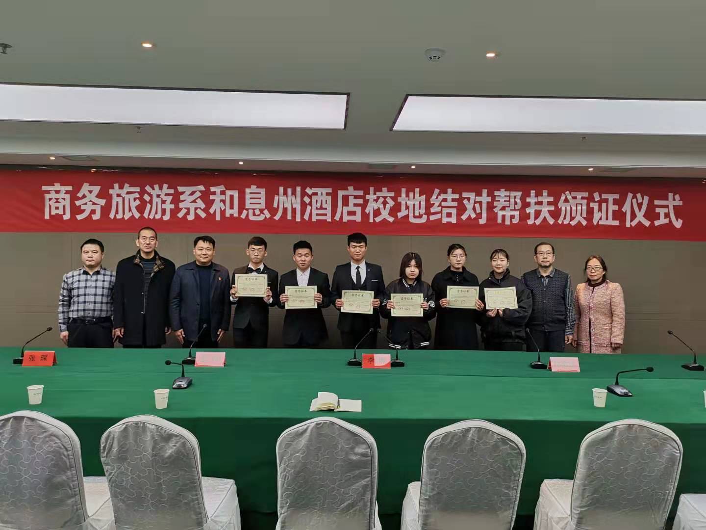 息县副县长李博和商务旅游系主任陈振锋,共同看望了在息州酒店实训帮扶的6名学生,实地察看了他们的工作环境、岗位工作内容和食宿等情况,与学生们亲切交谈。李博副县长对学生们的实训帮扶工作,给予高度评价和充分肯定,并为他们颁发了“校地结对帮扶先进个人”荣誉证书。息县息州酒店经理孙华、息县利行电子商务产业园负责人姚志强等详细介绍了公司现状及发展前景,对公司目前的市场发展趋势和技能型人才的需求与要求进行了深入的探讨。