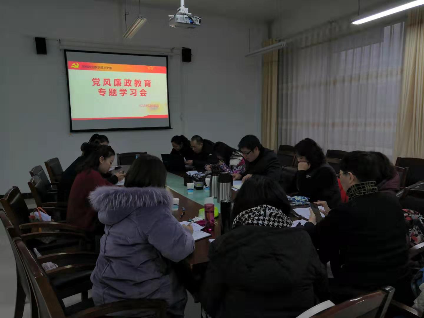 12月25日下午,思想政治教学部党支部在新校区思政部会议室开展党风廉政教育专题学习会议。思政部全体党员参加会议。会议由党支部书记刘喜要主持。