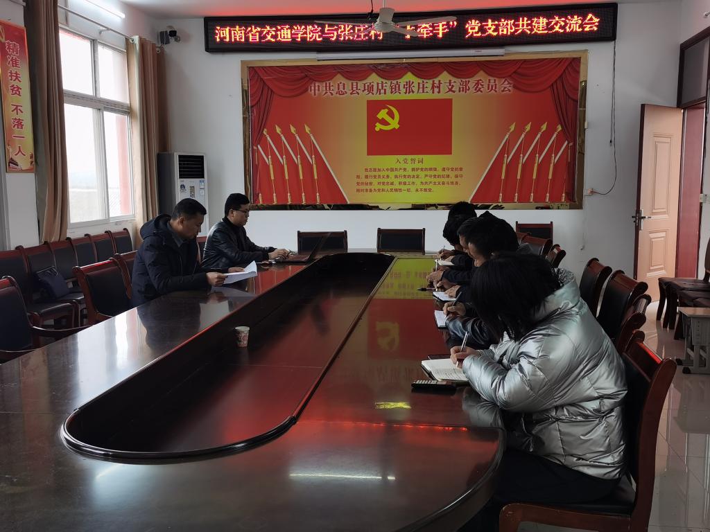 公路学院教工党支部组织委员孟国东、宣传委员王兆仑,首先来到信阳市息县项店镇张庄村,与张庄村党支部开展了结对共建基层党建工作,从基层组织、基层队伍、基本制度入手,共学理论、共建班子、共建队伍、共促发展、共树新风。