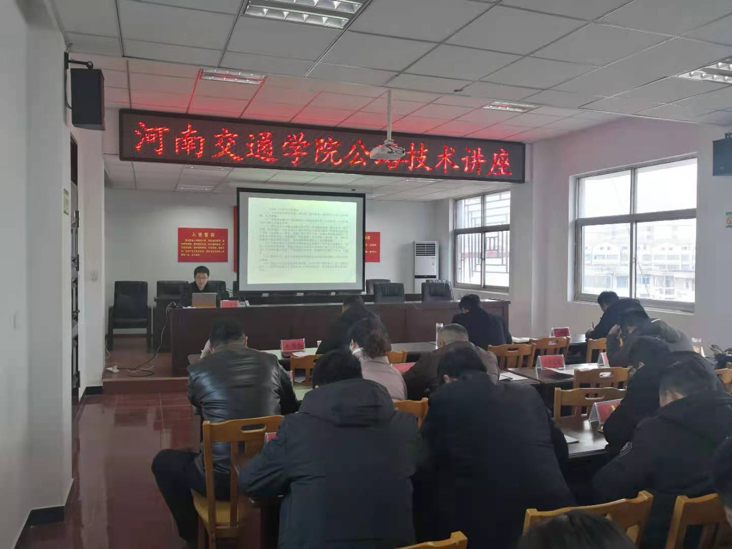 次日,孟国东与城市轨道工程技术教研室主任闫海峰,来到息县交通运输局,对息县交通运输局及其下属单位的60余名技术及管理人员开展了公路工程技术专题培训。培训内容分别以《BIM技术在南水北调特大桥施工中的应用》和《公路路基施工关键技术》为主题,详细介绍了公路桥梁建设过程中BIM技术应用及发展情况、路基施工标准化的技术重点与难点。