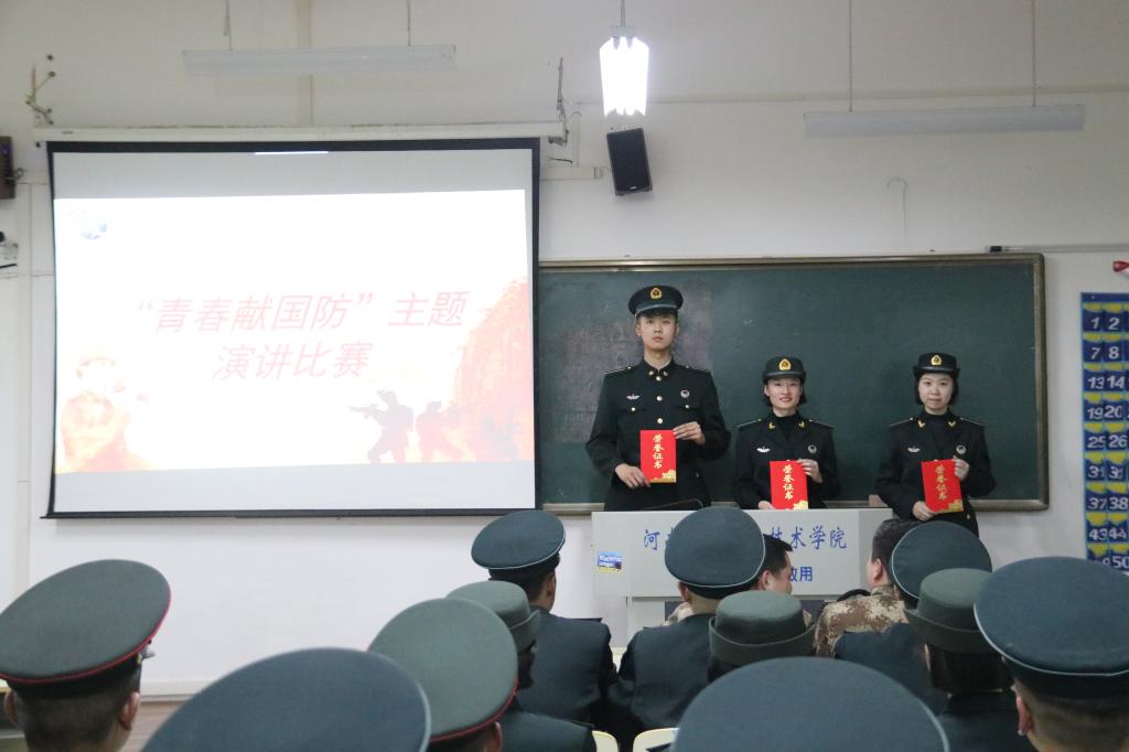 参赛选手围绕“青春献国防”这一主题,结合学习强军思想、戍边英雄人物事迹、立志携笔从戎、青春无悔固国防等内容,展开精彩演讲。选手们紧扣主题、观点新颖、激情飞扬、真情流露,赢得了评委和听众们的一致好评。经过激烈角逐,火箭网络20301班段雅馨同学的《国防梦 青春行》、火箭电子19303班徐逢蔚同学的《看我青春多励志 青春无悔铸军魂》和火箭电子19302班张清博同学的《强军强国梦 铁血守边疆》的演讲分别获得一、二、三等奖。