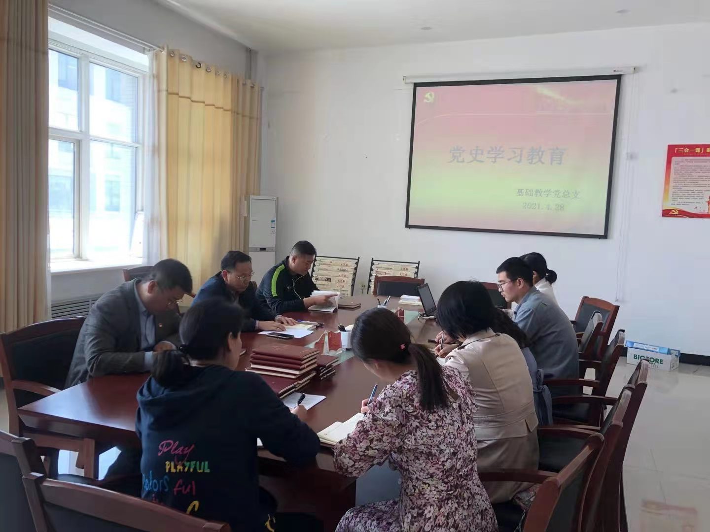 4月28日,基础教学党总支在学校东校区召开党史学习教育专题会议,党总支委员和各支部党务工作者参加会议,会议由基础教学党总支书记孙红伟主持。