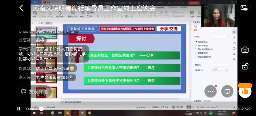 学生代表发言结束后,工作室几位老师分别围绕如何做好心理调适、如何与父母更好沟通、如何利用假期充实提升自己、如何更好为家乡疫情防控做贡献等几个方面作详细分享,并再次强调一定要遵守属地疫情防控管理要求,严格按照学校相关管理规定,切实提高个人疫情防护水平,保证自身健康与平安。