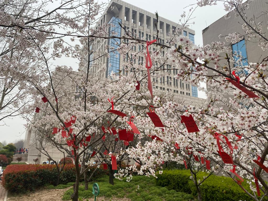 在春暖花开之时,3月22日,由校团委组织的“春日寄语”主题活动在图书馆和明德楼旁边开展。同学们领取红色卡片,将自己的祝福和愿望写在上面并挂于花树枝头。卡片随着清风起舞,引得师生纷纷驻足围观。