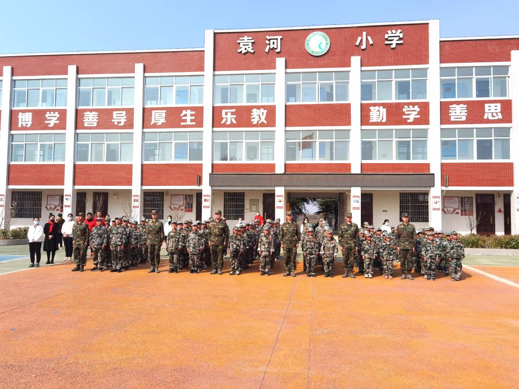 军训结营典礼上,袁河小学党支部书记、校长刘昆宇向参与国防军事共建的河南交院的优秀教官表示感谢,并号召全校师生爱国拥军,传承红色基因,向军人致敬!。